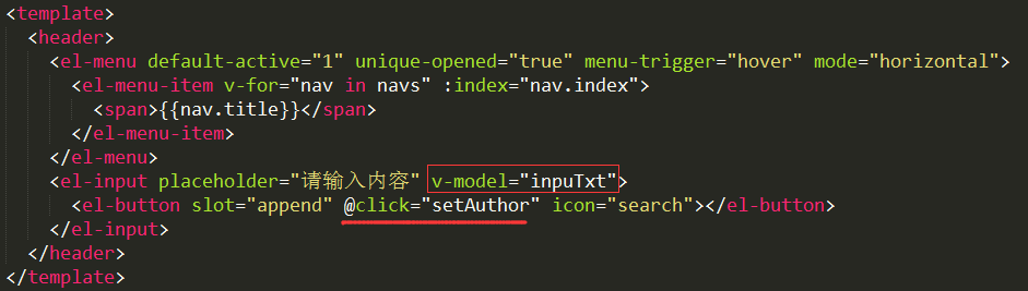 上面将输入框 input 的值绑定为 inputTxt,然后在后面的按钮 button 上绑定 click 事件,触发 setAuthor 方法
