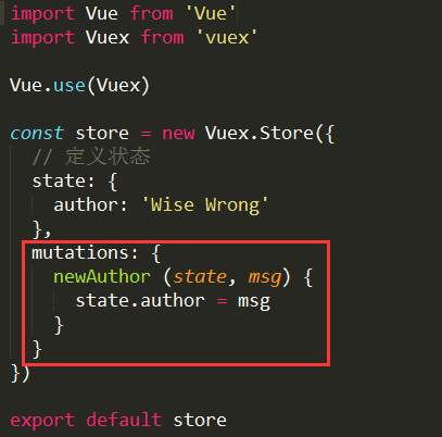 首先在 store.js 中定义一个方法 newAuthor,其中第一个参数 state 就是 $store.state,第二个参数 msg 需要另外传入