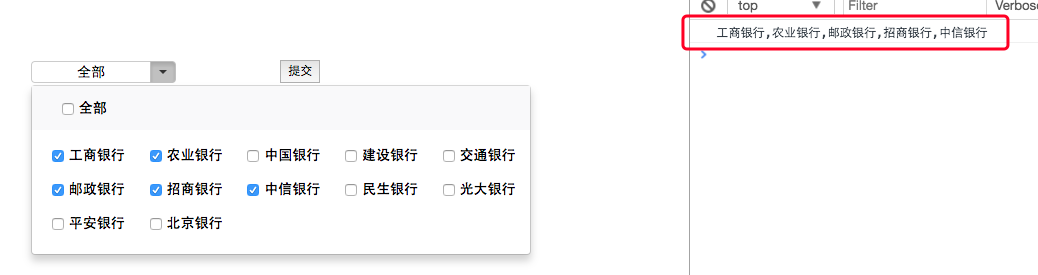 另外,需要新增加的功能是,点击“保存”按钮的时候,需要把选中的银行名称以逗号拼接成字符串传递给后台。这部分比较简单,代码如下:
