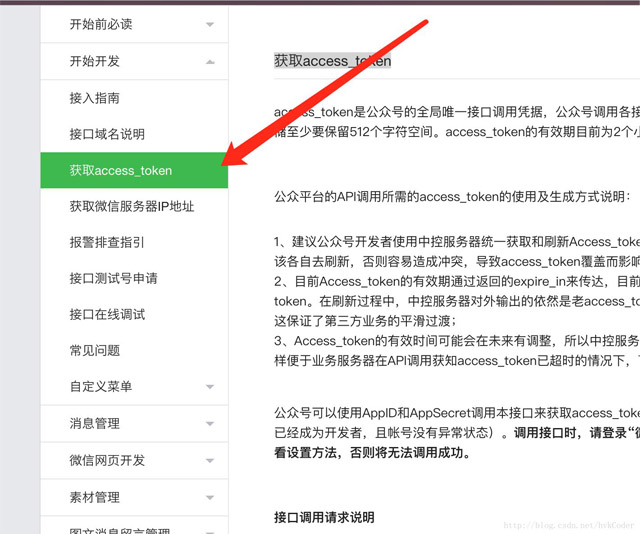 在开始码代码之前,我们依然是先理清实现的思路,在开始编写实现代码。打开 微信帮助文档 ,点击左侧菜单中的开始开发,点击其子菜单获取access_token,如图: