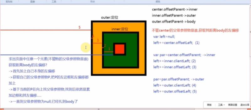 2、offsetParent:父级参照物 在同一个平面中,最外层的元素是里面所有元素的父级参照物(和HTML层级结构没有必然的联系)