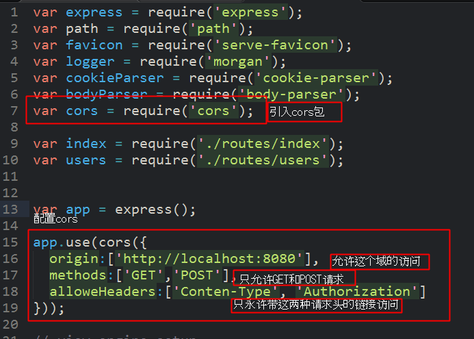 2.在app.js中配置:开启cors //就如我下图配置的一样