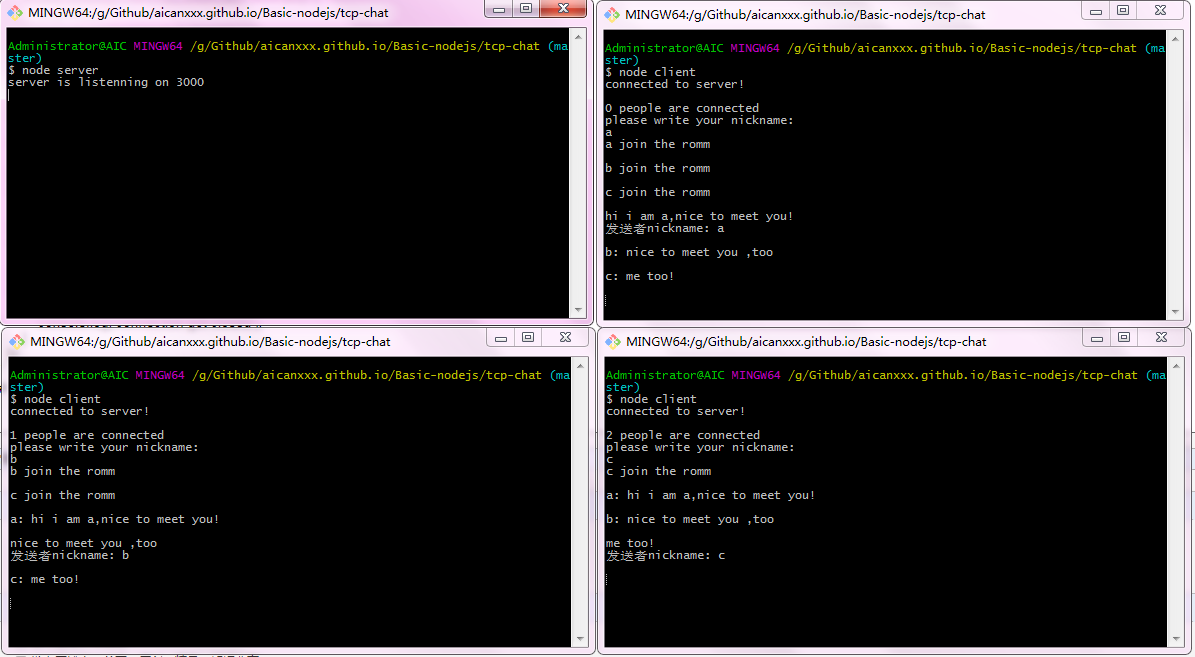 这里是在git中运行的,连接了3个客户端的测试结果: