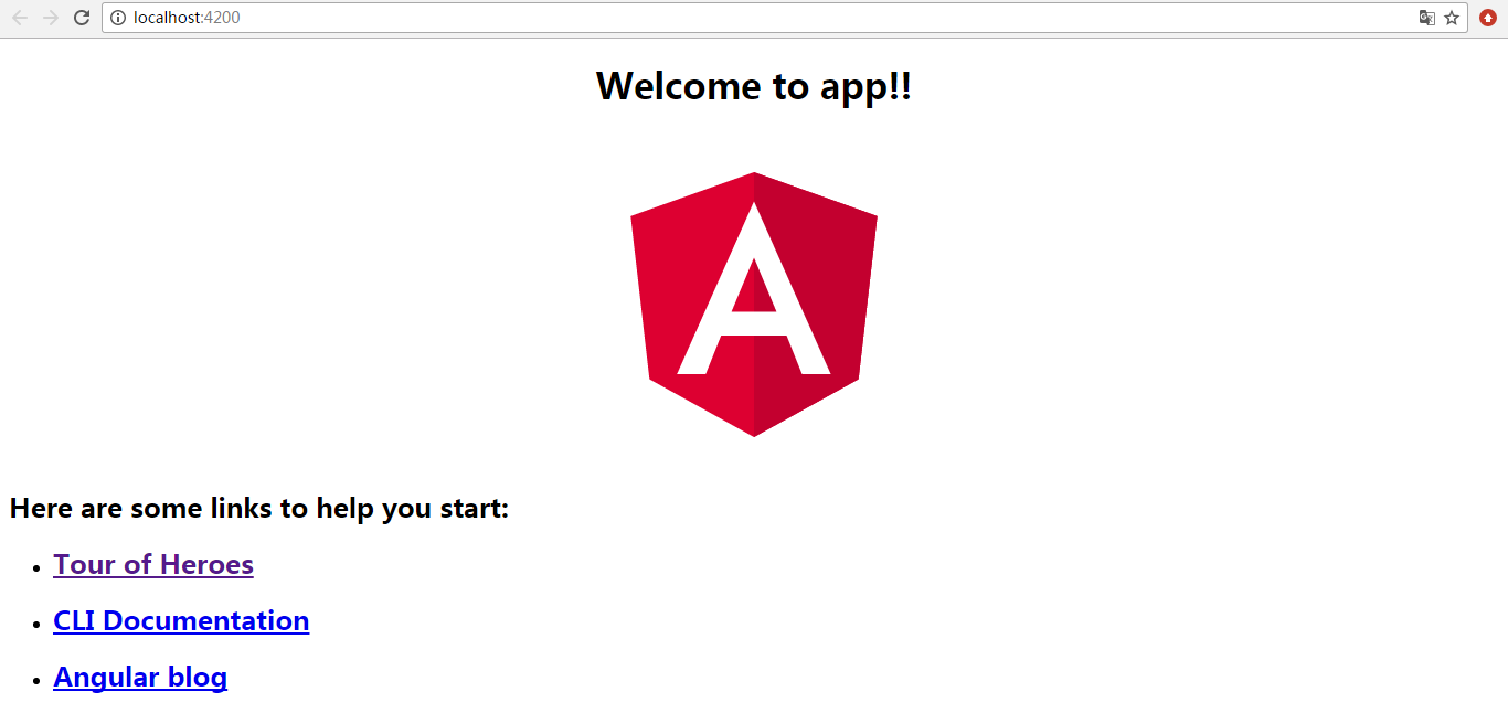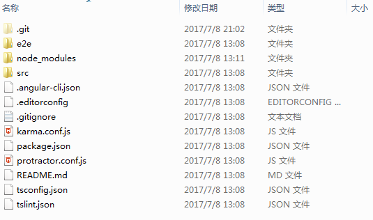 现在已经创建完成了,cd进入项目,会看到一些这样的东西,说明已经创建完成了,接下来就是执行项目就可以了,跟vue2.0一样,此时执行用到的代码为:ng serve --open(和vue的npm run dev效果是一样,自动监听修改内容),这一点也是不同于angularjs(官方称1.x为angularjs,过了2.0就直接称为angular)