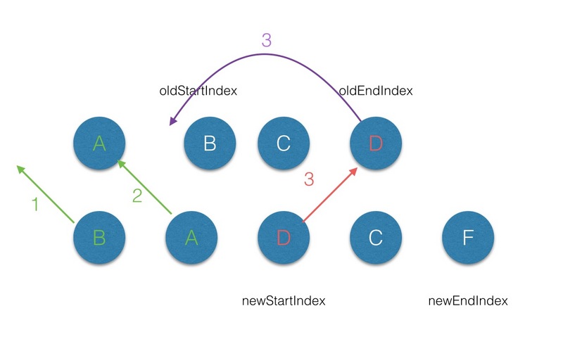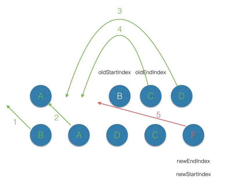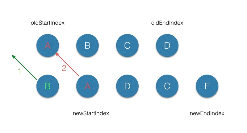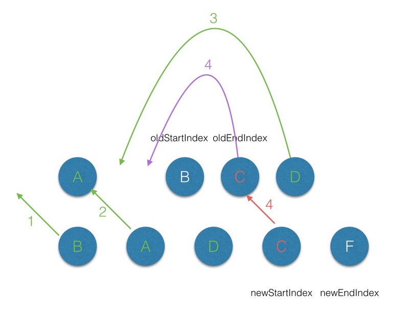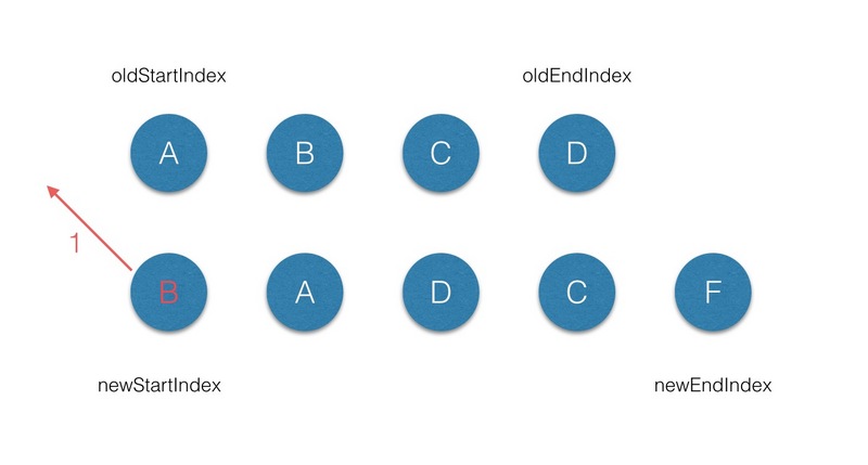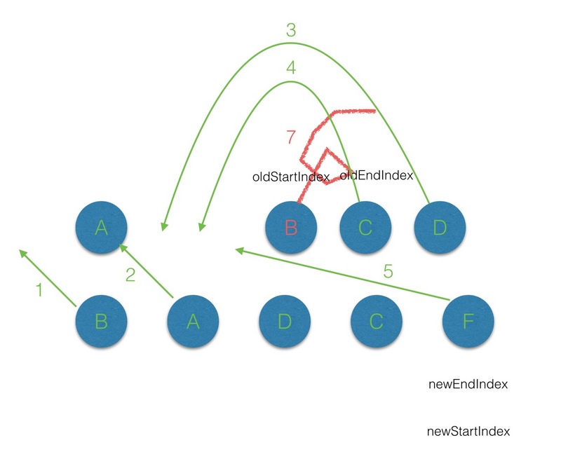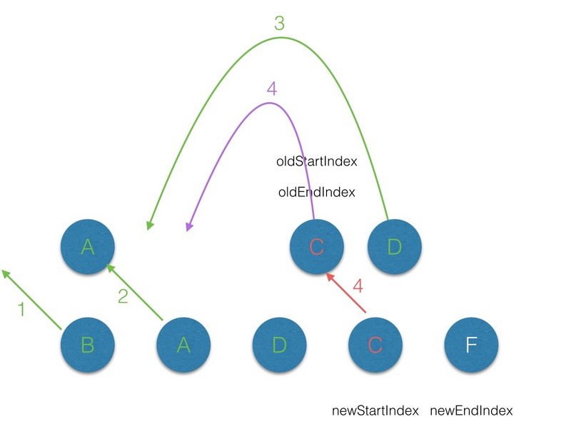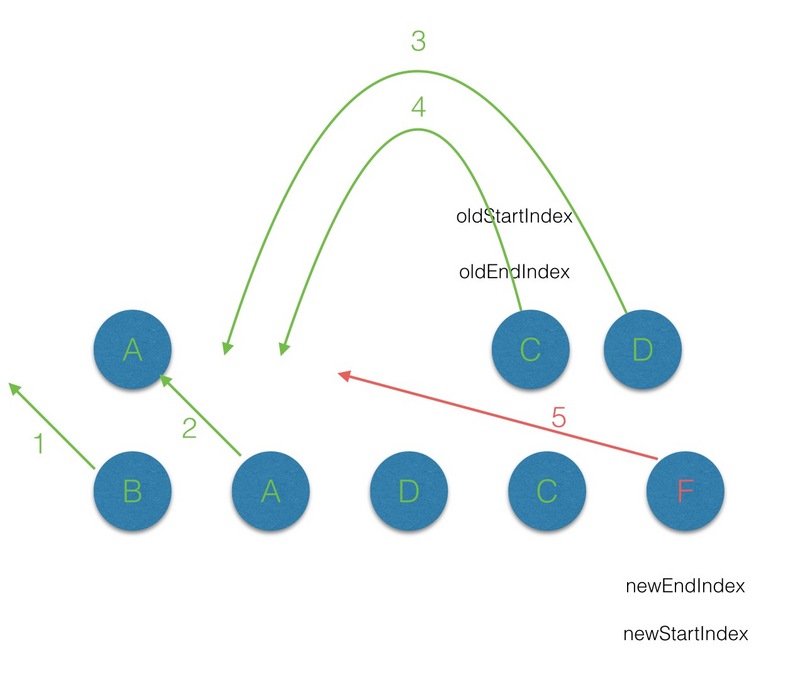 在开始遍历diff前,首先给oldCh和newCh分别分配一个startIndex和endIndex来作为遍历的索引,当oldCh或者newCh遍历完后(遍历完的条件就是oldCh或者newCh的startIndex >= endIndex),就停止oldCh和newCh的diff过程。接下来通过实例来看下整个diff的过程(节点属性中不带key的情况):