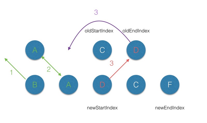第三轮的diff中,满足sameVnode(oldEndVnode, newStartVnode),那么首先对oldEndVnode和newStartVnode进行diff,并对oldEndVnode进行patch,并完成oldEndVnode移位的操作,最后newStartIndex前移一位,oldStartVnode后移一位;