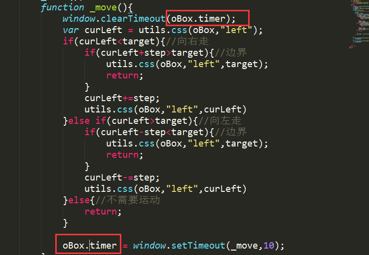 注意:为了让当前的元素在同一时间只运行一个动画(下一个动画开始的时候首先把上一个动画的定时器清除掉):保证当前元素所有动画接收定时器返回值的那个变量需要共享,有两种方式:1、全局接收(例如上面的代码 var timer = null)2、给元素增加自定义属性(如下图所示)