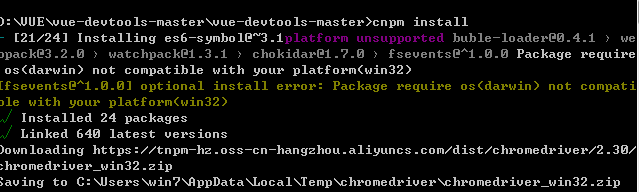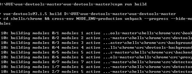 下载完成后打开命令行cmd进入vue-devtools文件夹,按照依赖包并npm run build