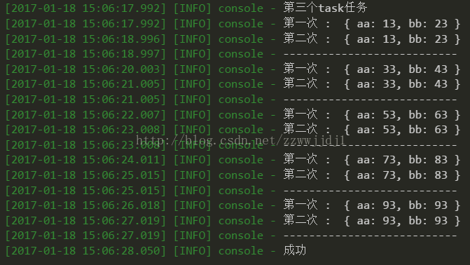 预期的结果是 : 首先执行task里的第一个任务,分别打印2次async_lists这个数组里的每个对象,而且每次打印间隔一秒,然后对async_lists重新赋值,执行task里的第二个任务,重复以上操作.3次完成后打印 成功,结束任务.