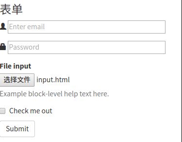 <h3>表单</h3> <form> <div class="form-group"> <span class="glyphicon glyphicon-user"></span> <input type="email" id="exampleInputEmail1" placeholder="Enter email"> </div> <div class="form-group"> <span class="glyphicon glyphicon-lock"></span> <input type="password" id="exampleInputPassword1" placeholder="Password"> </div> <div class="form-group"> <label for="exampleInputFile">File input</label> <input type="file" id="exampleInputFile"> <p class="help-block">Example block-level help text here.</p> </div> <div class="checkbox"> <label> <input type="checkbox"> Check me out </label> </div> <button type="submit" class="btn btn-default">Submit</button> </form>