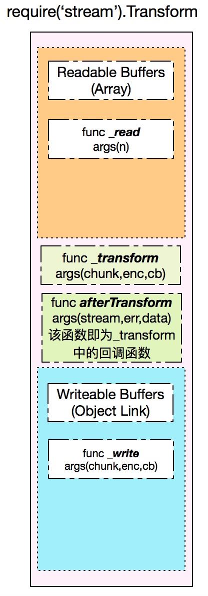 传统意义的流(即Readable和Writeable)的实现者都需要实现对应的内部函数_read()和_write(),对于Readable实例而言,_read函数用于准备从源文件中获取数据并添加到读缓冲中;对于Writeable实例_write函数则从写缓冲链表中一次刷入到磁盘中。它们分别对应了读写流程的首尾步骤,具体可以关注node中的Stream一文。