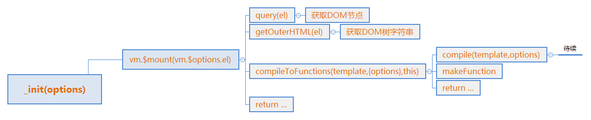 忽略2段dev模式下的提示代码,剩下的代码做了3件事,调用compileToFunctions函数肢解DOM树字符串,将返回的对象属性添加到options上,再次调用mount函数。