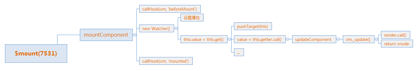 这个函数做了三件事,调用beforeMount钩子函数,生成Watcher对象,接着调用mounted钩子函数。