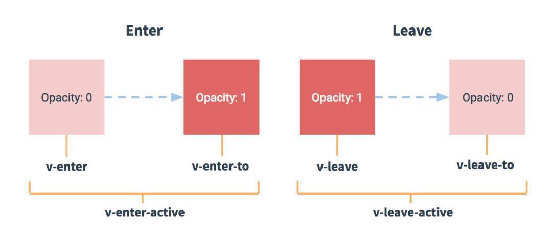 v-enter: 定义进入过渡的开始状态。在元素被插入时生效,在下一个帧移除。v-enter-active: 定义过渡的状态。在元素整个过渡过程中作用,在元素被插入时生效,在 transition/animation 完成之后移除。 这个类可以被用来定义过渡的过程时间,延迟和曲线函数。v-enter-to: 2.1.8版及以上 定义进入过渡的结束状态。在元素被插入一帧后生效(于此同时 v-enter 被删除),在 transition/animation 完成之后移除。v-leave: 定义离开过渡的开始状态。在离开过渡被触发时生效,在下一个帧移除。v-leave-active: 定义过渡的状态。在元素整个过渡过程中作用,在离开过渡被触发后立即生效,在 transition/animation 完成之后移除。 这个类可以被用来定义过渡的过程时间,延迟和曲线函数。v-leave-to: 2.1.8版及以上 定义离开过渡的结束状态。在离开过渡被触发一帧后生效(于此同时 v-leave 被删除),在 transition/animation 完成之后移除。