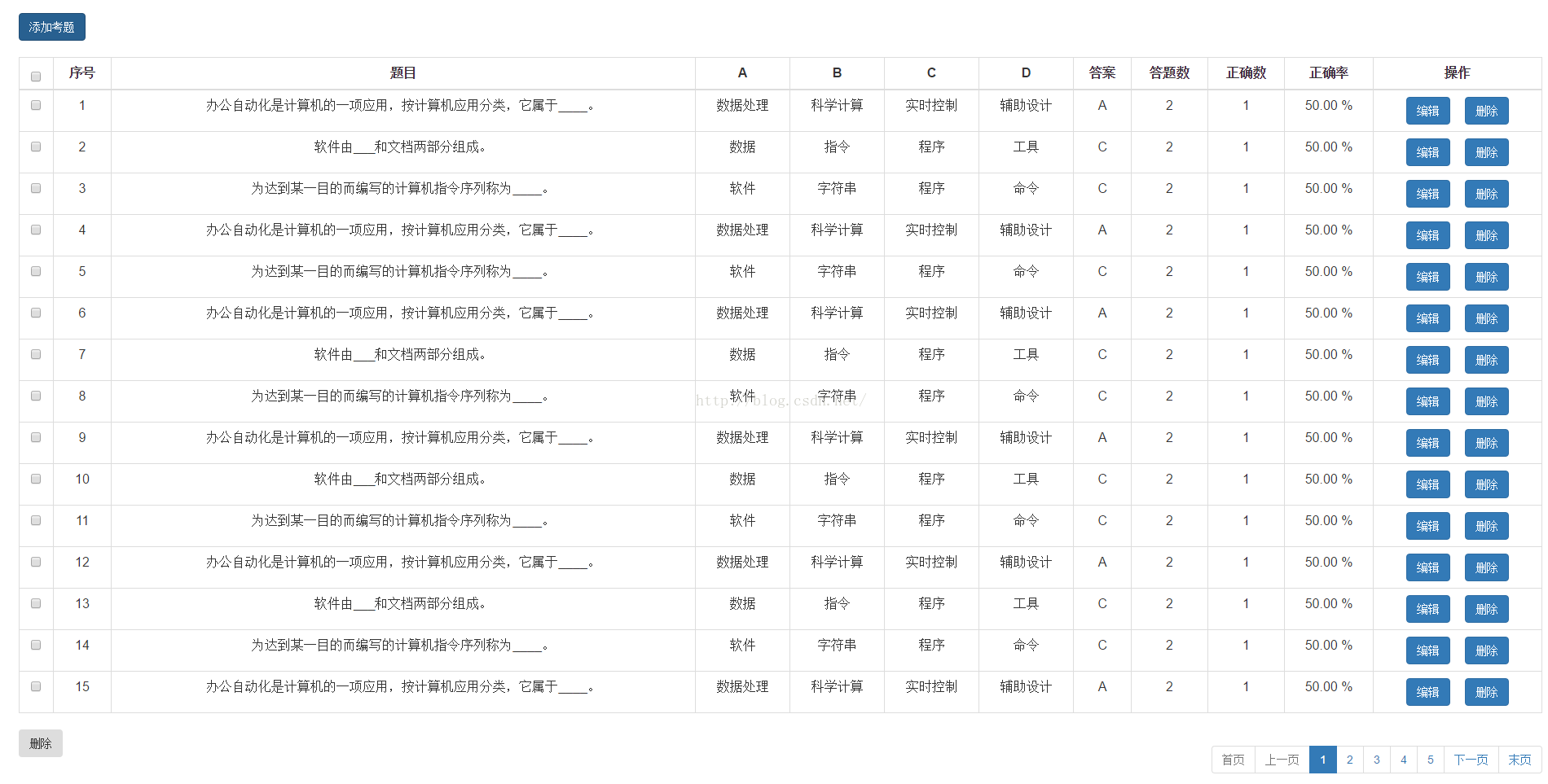 {"content":[{"id":225,"test":"办公自动化是计算机的一项应用,按计算机应用分类,它属于____。","op1":"数据处理","op2":"科学计算","op3":"实时控制","op4":"辅助设计","answer":"A","total":2,"totalCorrect":1},{"id":224,"test":"软件由___和文档两部分组成。","op1":"数据","op2":"指令","op3":"程序","op4":"工具","answer":"C","total":2,"totalCorrect":1},{"id":223,"test":"为达到某一目的而编写的计算机指令序列称为____。","op1":"软件","op2":"字符串","op3":"程序","op4":"命令","answer":"C","total":2,"totalCorrect":1},{"id":222,"test":"办公自动化是计算机的一项应用,按计算机应用分类,它属于____。","op1":"数据处理","op2":"科学计算","op3":"实时控制","op4":"辅助设计","answer":"A","total":2,"totalCorrect":1},{"id":220,"test":"为达到某一目的而编写的计算机指令序列称为____。","op1":"软件","op2":"字符串","op3":"程序","op4":"命令","answer":"C","total":2,"totalCorrect":1},{"id":219,"test":"办公自动化是计算机的一项应用,按计算机应用分类,它属于____。","op1":"数据处理","op2":"科学计算","op3":"实时控制","op4":"辅助设计","answer":"A","total":2,"totalCorrect":1},{"id":218,"test":"软件由___和文档两部分组成。","op1":"数据","op2":"指令","op3":"程序","op4":"工具","answer":"C","total":2,"totalCorrect":1},{"id":217,"test":"为达到某一目的而编写的计算机指令序列称为____。","op1":"软件","op2":"字符串","op3":"程序","op4":"命令","answer":"C","total":2,"totalCorrect":1},{"id":216,"test":"办公自动化是计算机的一项应用,按计算机应用分类,它属于____。","op1":"数据处理","op2":"科学计算","op3":"实时控制","op4":"辅助设计","answer":"A","total":2,"totalCorrect":1},{"id":215,"test":"软件由___和文档两部分组成。","op1":"数据","op2":"指令","op3":"程序","op4":"工具","answer":"C","total":2,"totalCorrect":1}],"last":false,"totalPages":9,"totalElements":86,"number":0,"size":10,"sort":[{"direction":"DESC","property":"id","ignoreCase":false,"nullHandling":"NATIVE","ascending":false}],"numberOfElements":10,"first":true}