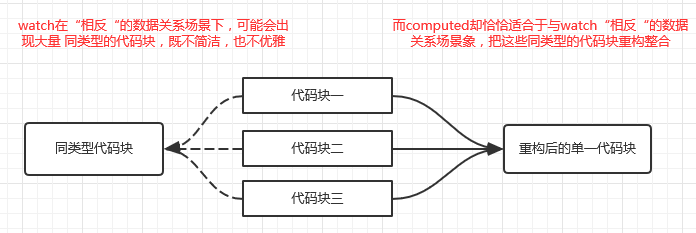 在很多时候,computed是用来处理你使用watch和methods的时候无法处理,或者是处理起来并不太恰当的情况的