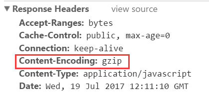 我们看到文本类文件的压缩效果非常显著,但是图片体积没变。看一下文本类的http响应头是有gzip压缩过: