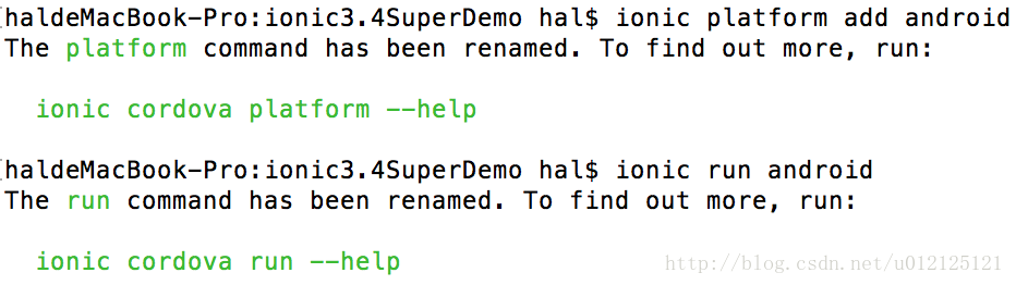 为什么会出现如上图所示的情况。在官博相关资料中有介绍,Ionic团队为了提高其性能和用户体验,重写了CLI。更新后的其中一个变化就是和Cordova CLI交互相关的所有命令,都需要将cordova作为命令的一部分。以前我们是执行以下命令