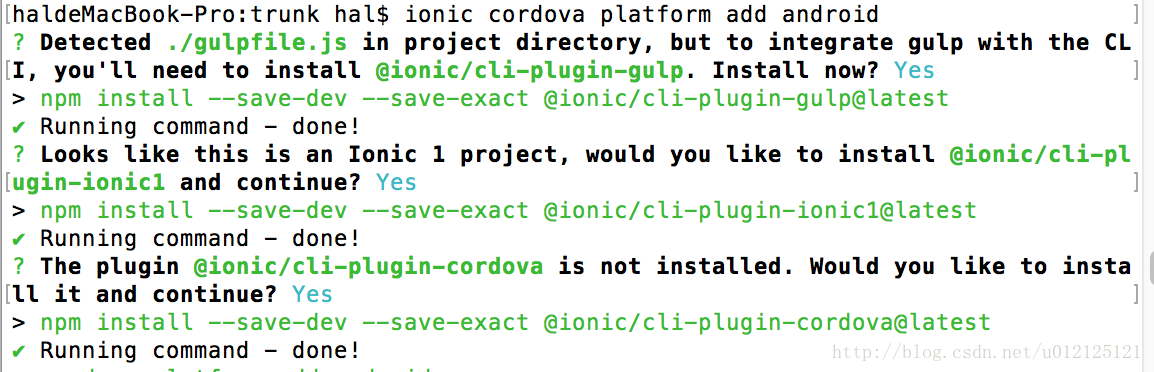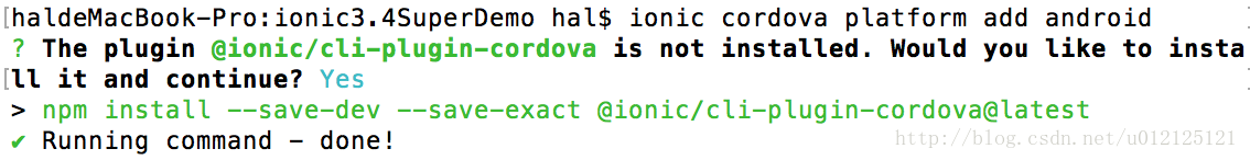 第一次在项目中执行该命令,会弹出如下提示,是因为Ionic CLI的Cordova功能已被移植到一个插件中,当检测到没有该插件时,会提示用户安装。