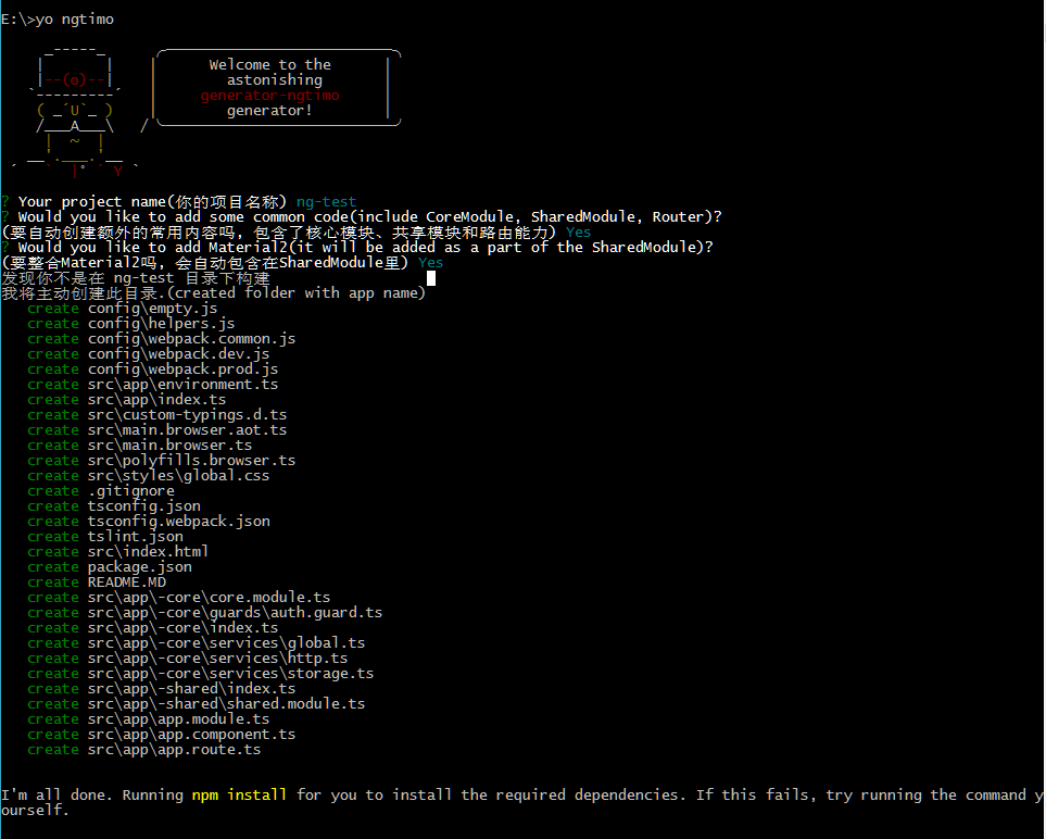 首先确保已经全局安装了yeoman,然后再全局安装generator-ngtimo: