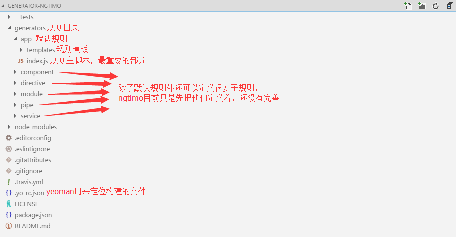 yeoman的generator说白也只是一个npm包,主要依赖yeoman-generator包来制定构建规则,这里给出ngtimo的基本目录结构: