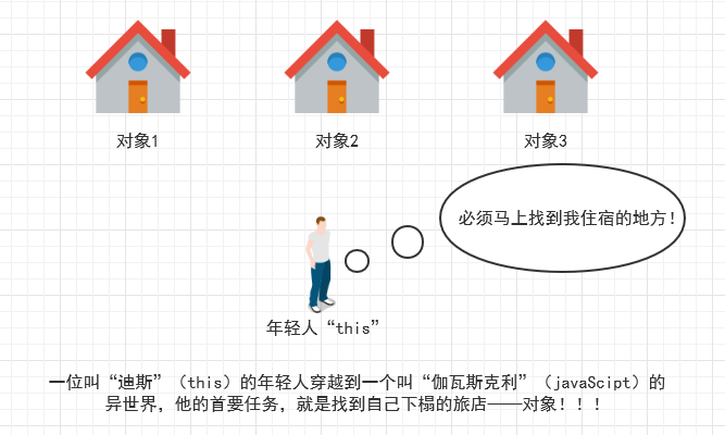 【故事】有一个年轻人叫"迪斯"(this),有一天,迪斯不小心穿越到一个叫 “伽瓦斯克利”(javascript)的 异世界,此时此刻迪斯身无分文, 他首先要做的事情就是——找到他的住宿的地方——调用函数的对象