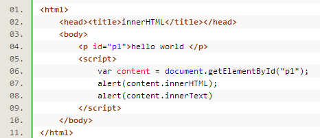alert(content.outerHTML)则弹出:"<p id="p1">hello world</p>"