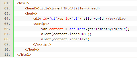 alert(content.outerHTML)则弹出:"<div id="d1"><p id="p1">hello world</p></div>"