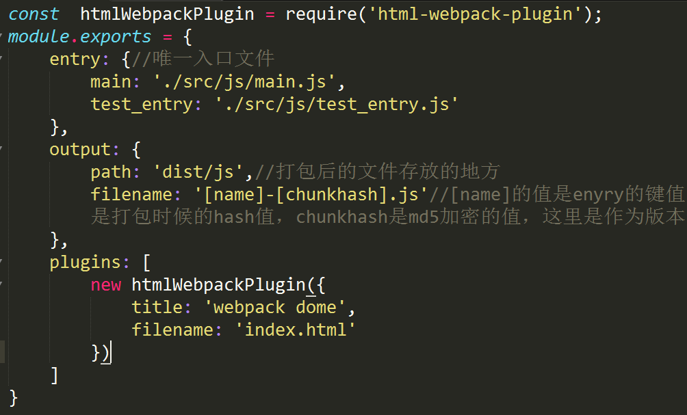 plugins的值是一个<strong>数组</strong>,里面的值都是 new htmlWebpackPlugin(),参数一个配置数组,如下: