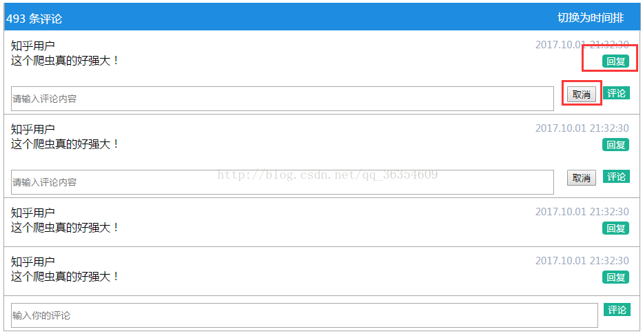 <div class="nr-comment"> <div class="nr-comment-con"> <div class="nr-comment-nav"> <div class="comment-number"> <span>493</span> <span>条评论</span> </div> <div class="comment-sort"> 切换为时间排序 </div> </div> <div class="comment-content"> <div class="com-users"> <div class="comment-user"> <span>知乎用户</span> <div class="comment-user-content"> 这个爬虫真的好强大! </div> </div> <div class="comment-time"> <div>2017.10.01 21:32:30</div> <button class="btn btn-primary btn-sm btn-reply">回复</button> </div> </div> <div class="user-reply"> <duv class="reply-in"> <input type="text" value="" name="" placeholder="请输入评论内容" /> </duv> <div class="reply-buttons"> <button type="button" class="btn btn-primary btn-comment btn-sm">评论</button> <button type="button" class="btn btn-default btn-cancel btn-sm">取消</button> </div> </div> </div> <div class="comment-content"> <div class="com-users"> <div class="comment-user"> <span>知乎用户</span> <div class="comment-user-content"> 这个爬虫真的好强大! </div> </div> <div class="comment-time"> <div>2017.10.01 21:32:30</div> <button class="btn btn-primary btn-sm btn-reply">回复</button> </div> </div> <div class="user-reply"> <duv class="reply-in"> <input type="text" value="" name="" placeholder="请输入评论内容" /> </duv> <div class="reply-buttons"> <button type="button" class="btn btn-primary btn-comment btn-sm">评论</button> <button type="button" class="btn btn-default btn-cancel btn-sm">取消</button> </div> </div> </div> <div class="comment-content"> <div class="com-users"> <div class="comment-user"> <span>知乎用户</span> <div class="comment-user-content"> 这个爬虫真的好强大! </div> </div> <div class="comment-time"> <div>2017.10.01 21:32:30</div> <button class="btn btn-primary btn-sm btn-reply">回复</button> </div> </div> <div class="user-reply"> <duv class="reply-in"> <input type="text" value="" name="" placeholder="请输入评论内容" /> </duv> <div class="reply-buttons"> <button type="button" class="btn btn-primary btn-comment btn-sm">评论</button> <button type="button" class="btn btn-default btn-cancel btn-sm">取消</button> </div> </div> </div> <div class="comment-content"> <div class="com-users"> <div class="comment-user"> <span>知乎用户</span> <div class="comment-user-content"> 这个爬虫真的好强大! </div> </div> <div class="comment-time"> <div>2017.10.01 21:32:30</div> <button class="btn btn-primary btn-sm btn-reply">回复</button> </div> </div> <div class="user-reply"> <duv class="reply-in"> <input type="text" value="" name="" placeholder="请输入评论内容" /> </duv> <div class="reply-buttons"> <button type="button" class="btn btn-primary btn-sm btn-comment">评论</button> <button type="button" class="btn btn-default btn-sm btn-cancel">取消</button> </div> </div> </div> <div class="comment-ipt"> <input type="text" placeholder="输入你的评论"> <button type="submit" class="btn btn-sm btn-primary">评论</button> </div> </div> </div>