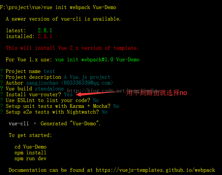 1.打开cmd,运行:vue init webpack Vue-Demo