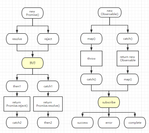 rxjs的套路则是先创建出一个观察者对象(Observable),可以用许多操作符定义许多规则,比如个人感觉很接近then的map操作符,以及接近catch的catch操作符。可以从map操作符中直接throw到错误回调,或者在catch操作符中捕捉错误并返回新的成功的流。这一切都不会触发这个请求,只有最终subscribe()的时候,才会真正执行整个请求,并在三种回调中体现。