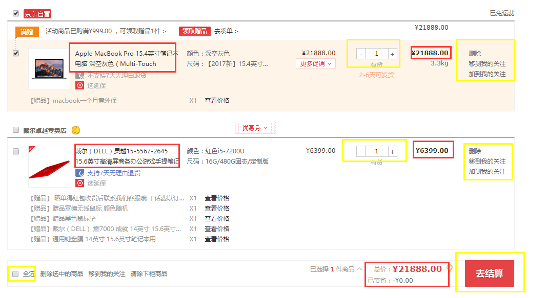 估计很多人都做过购物车,我就不卖关子,做任何东西,先宏观思考*,然后再去处理细节,然后组装起来,就好像组装汽车的道理一样。例如上图,红色的就是属性,黄色的就是方法,抽象出属性和方法,其他都是死的。