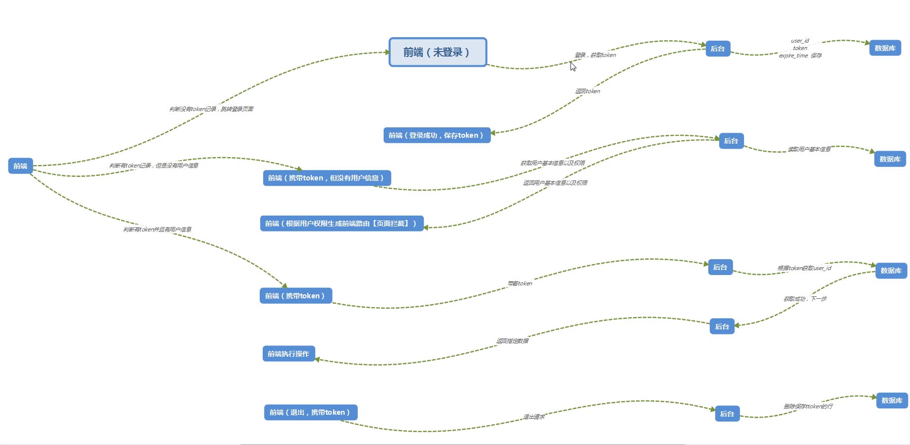 首先前端从cookie获取token,如果没有token就跳转到登录页面登录,登录验证之后生成token存在数据库中并返回给前端;前端将这个token保存下来,为了让在浏览器新的tab页时不需要登录,我们前端需要将这个token保存到cookie之中。