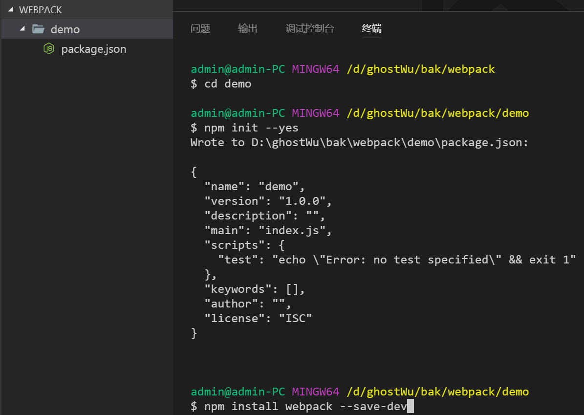 新建文件夹webpack->再在webpack下面新建demo->命令行切换到demo目录,使用npm init --yes 初始化项目的package.json文件,然后执行npm install webpack --save-dev