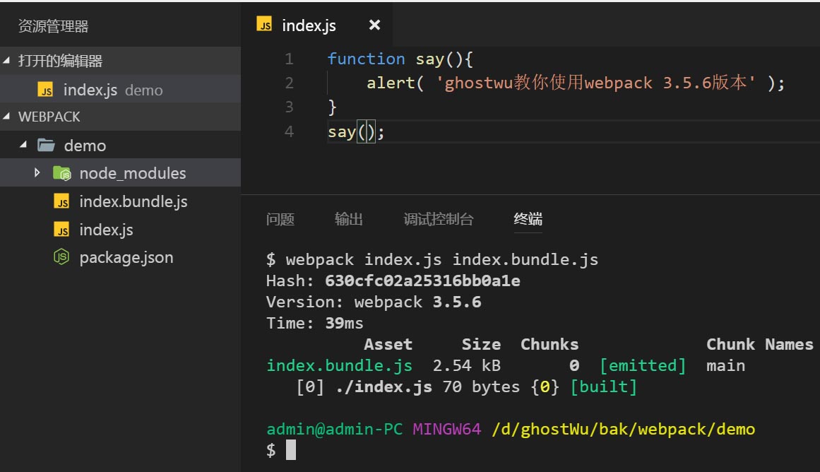 第三步、新建一个index.js文件,输入一个函数,弹出一些信息,然后调用函数,最后用webpack 打包( webpack index.js index.bundle.js ):把index.js文件打包成index.bundle.js