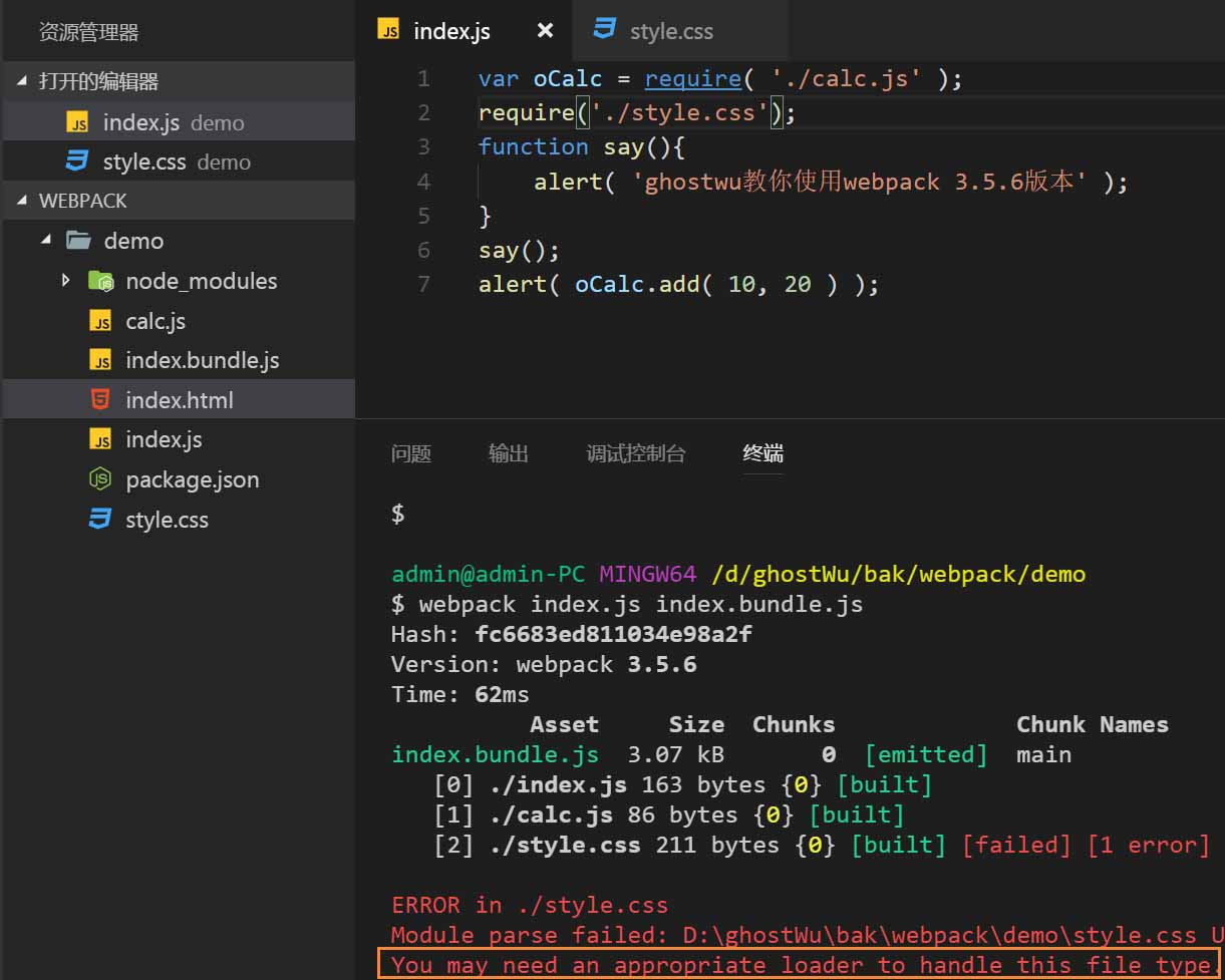 在当前目录下新建style.css文件,然后用require引入index.js文件中, 执行一次打包(webpack index.js index.bundle.js),这个时候会报错,报错信息显示为(你需要loader去处理css文件).