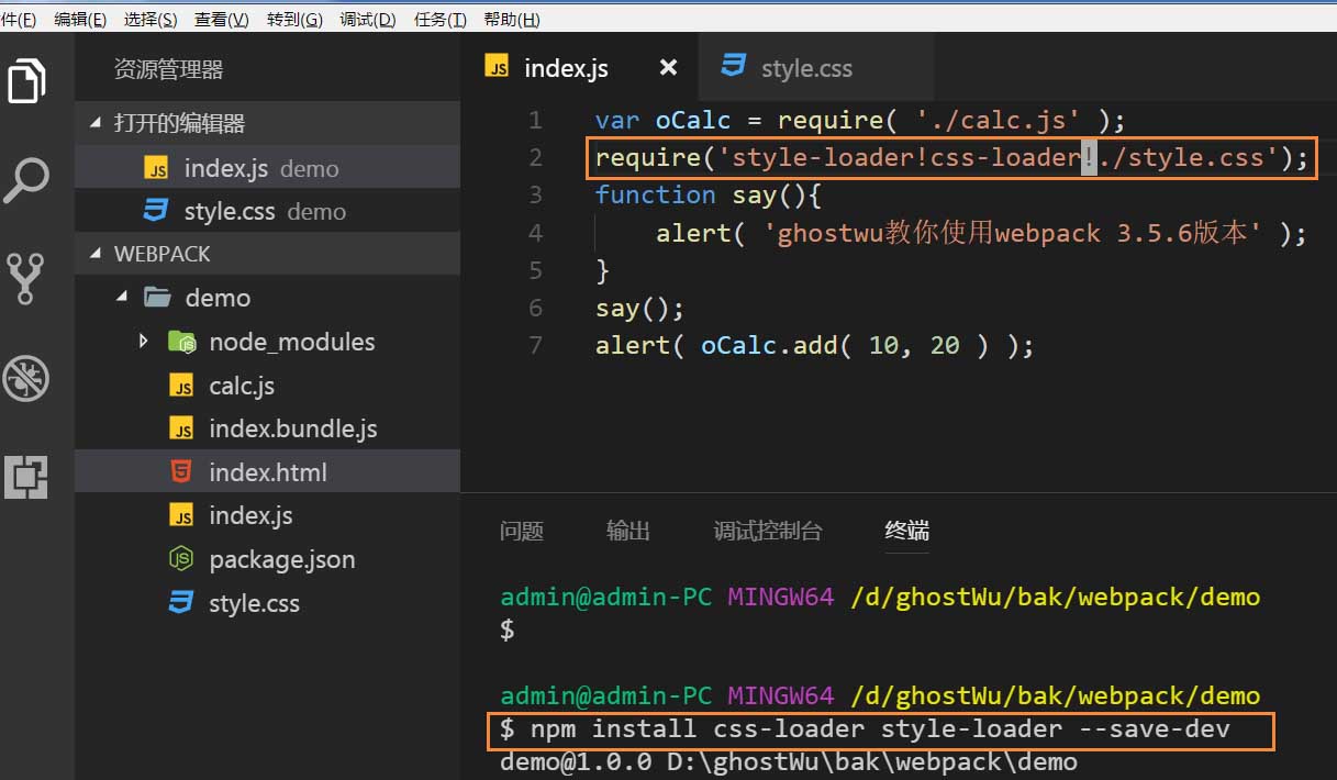 我们需要安装两个loader,css-loader,style-loader( 安装命令: npm install css-loader style-loader --save-dev ), 再用require加载