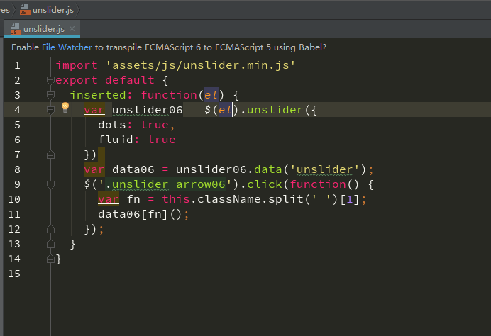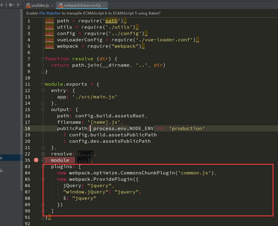 今天做官网,把unslider做成指令,但是一直提示$(el).unslider() no a function,一开始我想复杂了,后来在网上看了很多帖子,大多数都是修改webpack.base.config.js,仔细尝试,网上确实是对的,尝试过程中,提醒大家最好把这3个加全,比如unslider插件,(function(){})(window.jQuery)