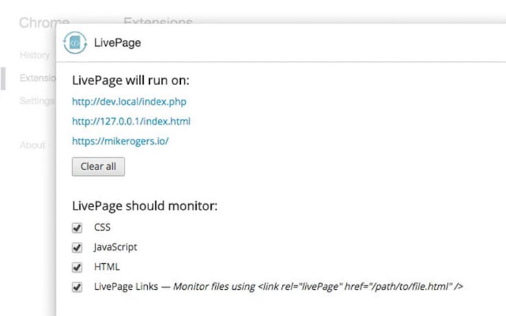一些浏览器插件是你用于开发的最佳工具。LivePage 就是一种免费的谷歌扩展插件,能在你对本地文件做出修改后自动刷新你的页面。