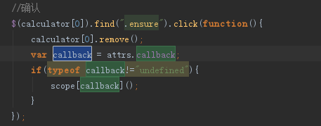 4、在项目中用到自定义的这个软键盘的时候有些需要在点击键盘的确定按钮之后需要进行一些数据处理,于是后来在directive的确定安妮中中加了一个回调,我们可以在点击确定之后调用这个回调,可以达到确定数字之后紧接着自动去执行需要执行的事件。只需要在dom中加上callback="functionItem()"即可。