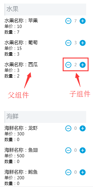 到了这个时候将子组件传过来的countFunc里的obj进行console.log(),你会发现父组件已经接收了一个对象:Object {count: 1, index: 0, parent: 0},也就是当我点击一下苹果的加号按钮时传过来count为1说明数量为1,parent索引为0说明是第一大类,index为0说明是第一大类下的苹果,至此已经实现了父子组件之间的事件发射和接收。