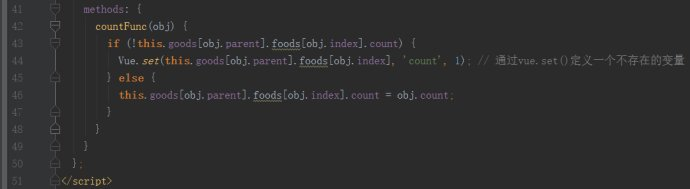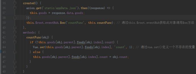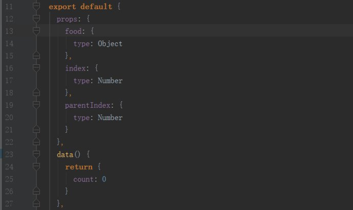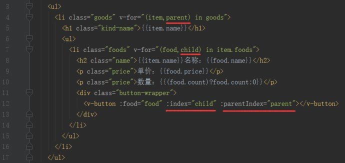 所以两层循环把数据展示在页面上,要精确将某个食物的数量显示必须知道第一大类和这一大类下这个食物的索引值,在这里在html那里先把两个索引传进子组件,在分发事件时再和数量一起打包成对象发射给父组件。