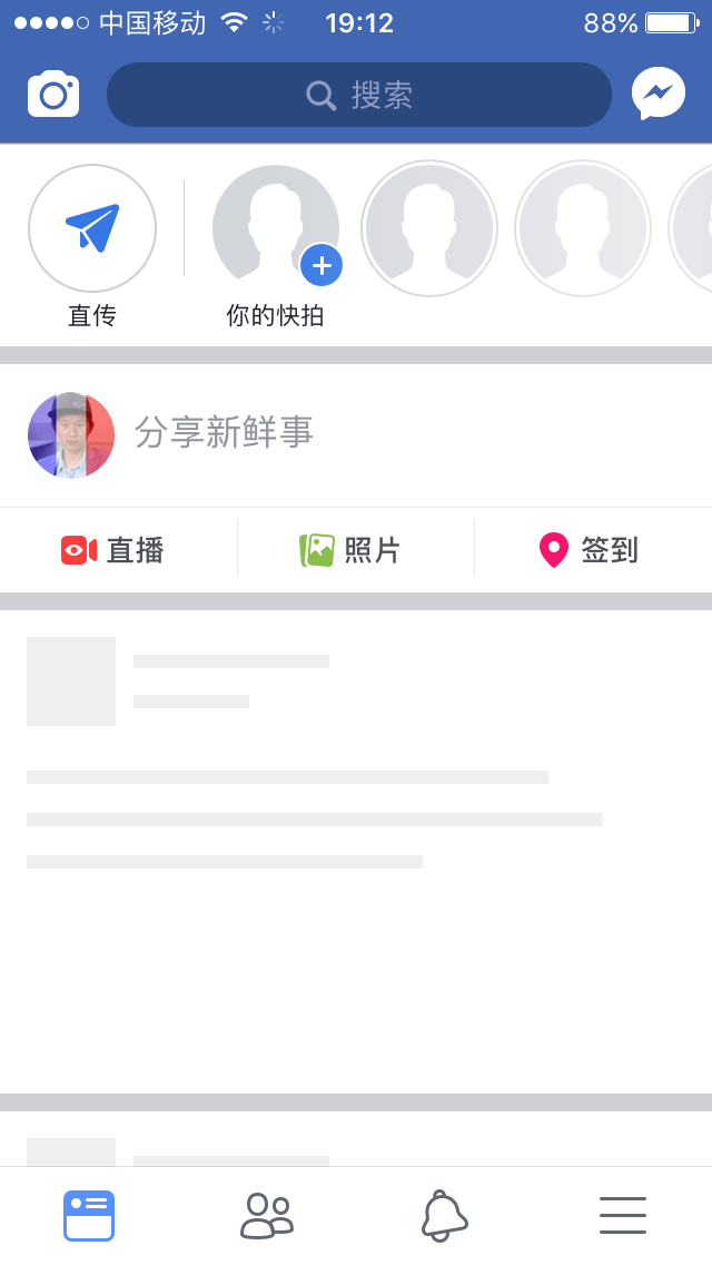 facebook首页列表是用一个接近真实布局的骨架动画来代替loading,这东西可以称之为skeleton screen或者placeholder,但是翻译过来真不知道该翻译成什么合适,这么做的好处就是在内容加载完成后可以做到流畅无缝切换真实布局,细节决定产品的质量,我觉得facebook对用户体验,交互的细节做的挺不错。先上一张我的fb截图。