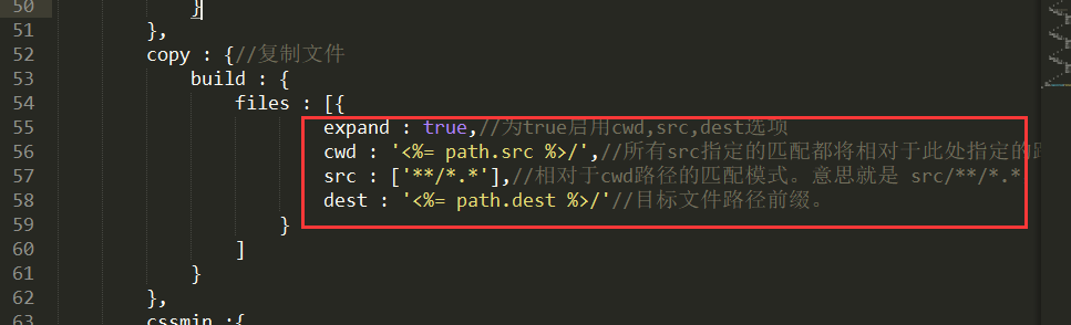 dest : '<%= path.dest %>/'//目标文件路径前缀。