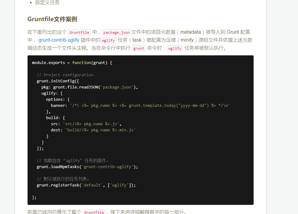 grunt.loadNpmTasks('grunt-contrib-uglify'); 从字面上就可以看出来/,加载能够提供"uglify"任务的插件。
