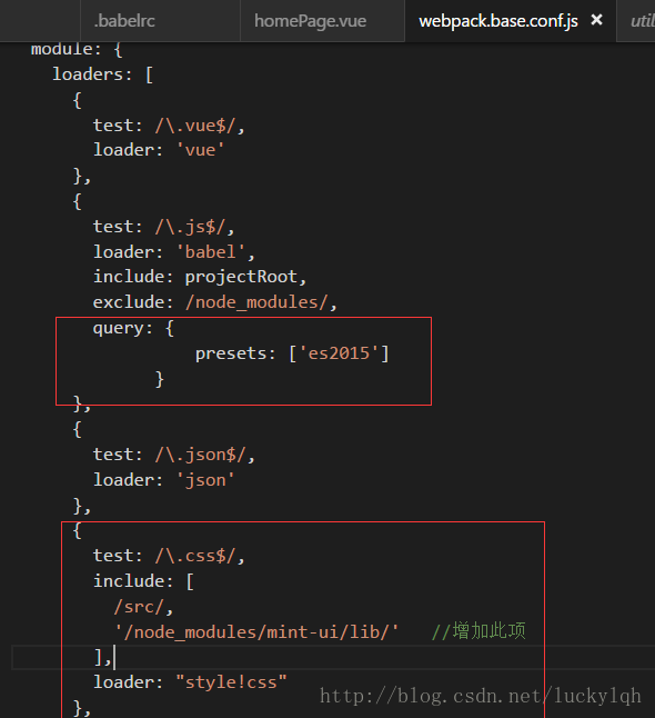 因为 在webpack.config中没有设置好css引入的目录,因为默认情况下我们只会引入/src/目录下的css, 但是mint-ui是要冲node_modules目录去引入的,所以在webpack.config中css的配置中加入一项