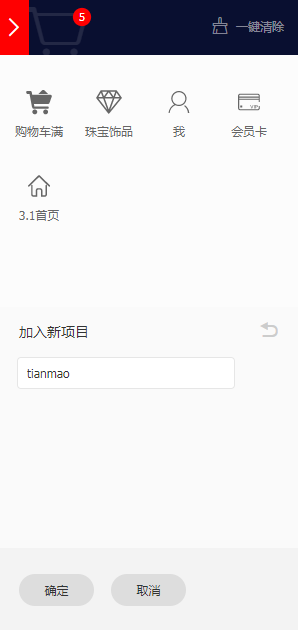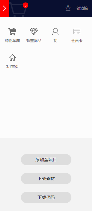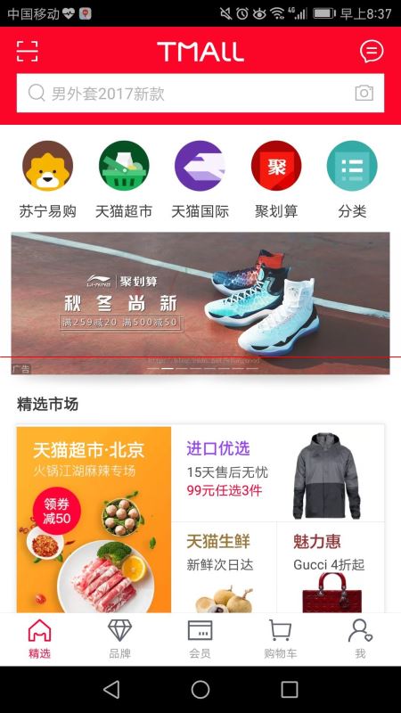 首先把天猫的导航贴出来,里面包括精选、品牌、会员、购物车、我五个导航及对应的图标。