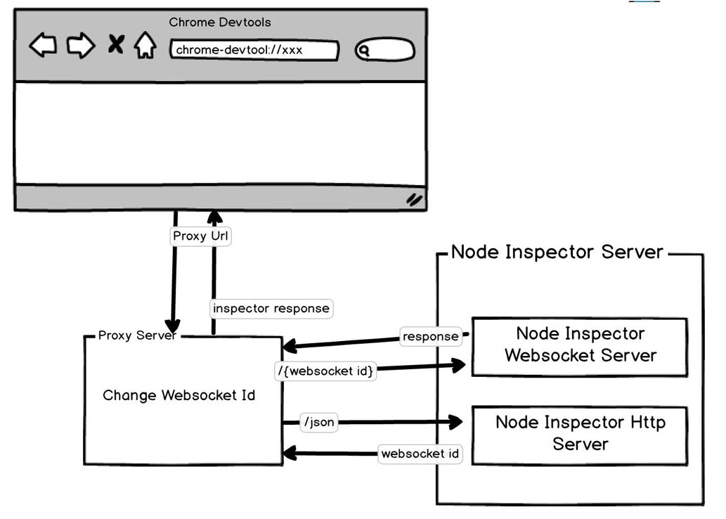 然后将其中的路径/__ws_proxy替换成对应的 websocketId,然后转发到 node 的 inspector server 上,即可完成 websocket 的握手,接下来的 websocket 通信就不需要对数据做处理,直接转发即可。