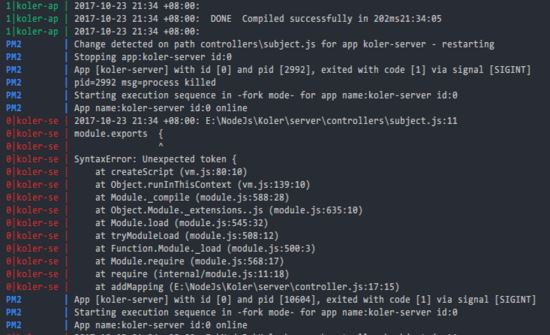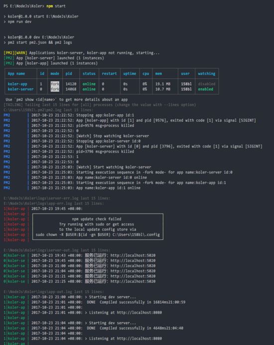 这里说明一下为什么在pm2.json配置文件里的第二个实例 koler-app 没有watch,因为vue在开发环境下使用的是wenpack的watch,所以不需要加。